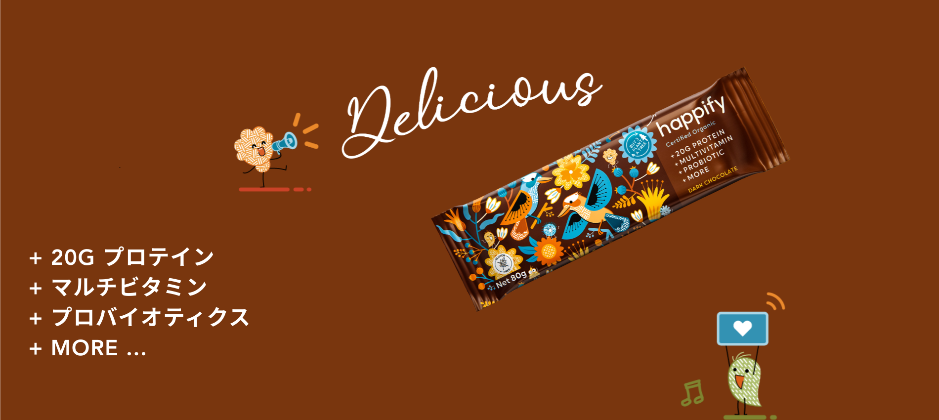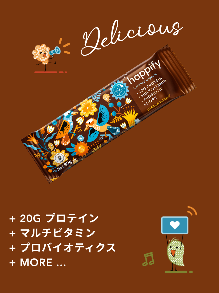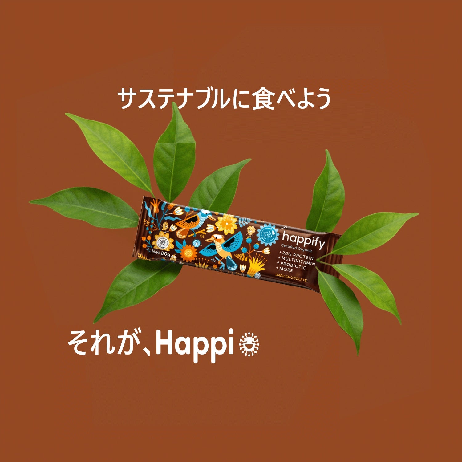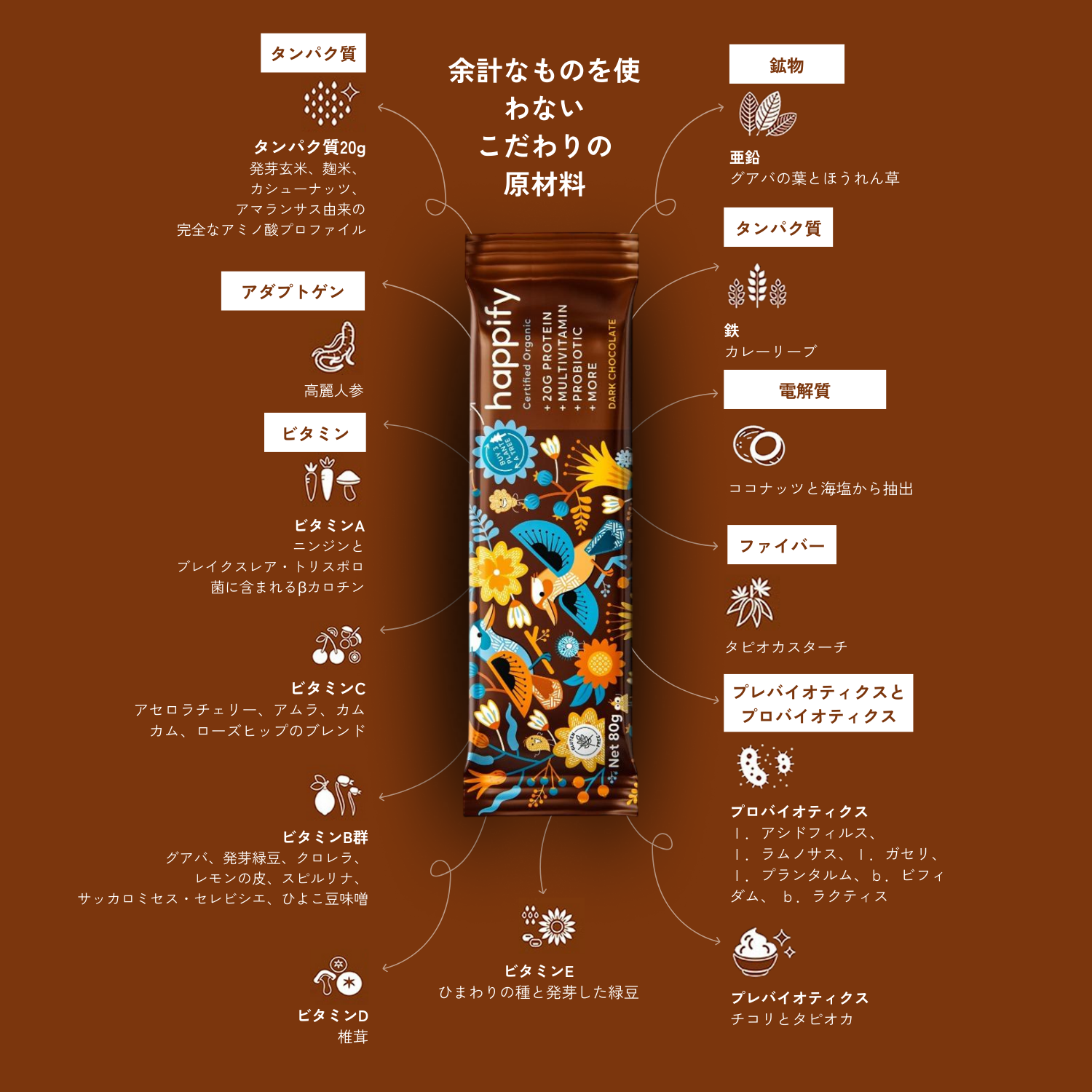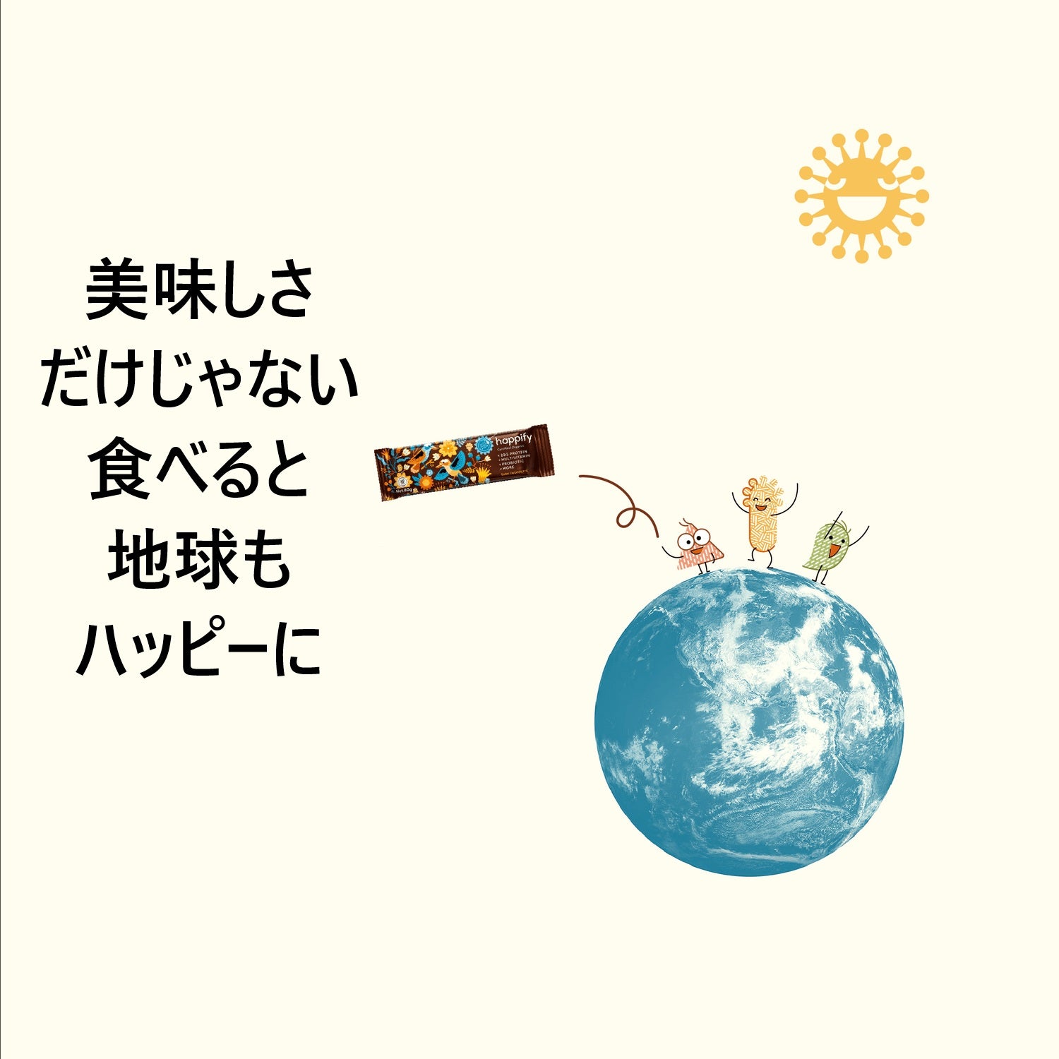 Happifyバーは、認証オーガニックのホールフードを使用し、体重70kgの人の1日推奨ビタミン摂取量の約34%を摂取できます。栄養価が高く美味しいだけでなく、非常食としても最適です。1箱12本入りで、1日に必要な量のほとんどを4日間摂取できます。どんなに辛い状況でも、一日を元気に過ごせる最高の味方です!